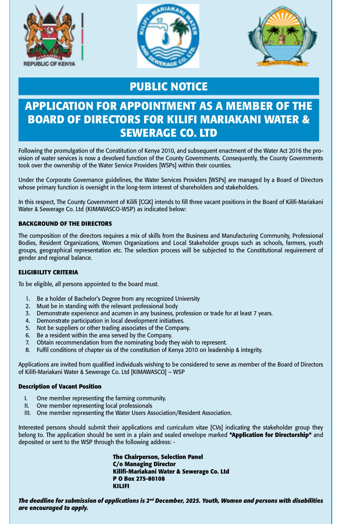 Application For Appointment As A Member Of The Board Of Directors For Kilifi Mariakani Water & Sewerage Co. LtdBy admin / 18/11/2025 Click here to download detailed requirements
